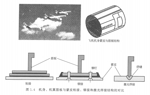 航空航天领城,在20世纪70年代之前,由于没有高功率连续激光器,主要是脉冲激光焊接应用子小型精密零件的点焊,或由单个焊点搭接而成的焊缝。20世纪70年代以后,随着数千瓦的co2激光焊接技术的研发,情况发生了根本性的变化。几毫米厚的钢板能够一次性焊透,所得焊缝与电子束焊接相似,显示了高功率激光焊接的巨大潜力。例如,空客A380之所以能大幅度减轻飞机质量、减少油耗、降低运营成本的主要原因,就是将激光焊技术应用于机身、机翼的内隔板与加强筋的连接(图1.4),取代原有的铆接工艺,被德国宇航界称为航空制造业中的一大技术革命。