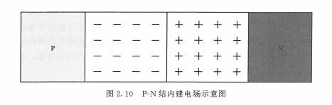 在一块半导体材料中,从P型区到N型区突变的区域称为P-N结。其交界面处形成一空间电荷区。N型半导体导带中的电子要向P区扩散,而P型半导体价带中的空穴要向N区扩散。这样一来.结区附近的N型区由于是施主而带正电,结区附近的P型区由于是受主而带负电。在交界面处形成一个由N区指向P区的电场,称为内建电场(或自建电场)。此电场会阻止电子和空穴的继续扩散(图2.10)。