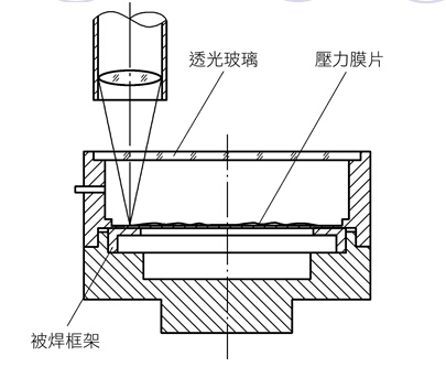 被焊框架和膜片用压圈固定好以后,在膜片上方很小的密闭气室内可以充满具有压力的氮气。氮气的作用有两个:其一,是保护激光焊接过程中熔化金属不被氧化,使熔道组成的焊缝整齐美观。其二,是通过足够大的压力,迫使膜片与框架紧密接触,以保证激光焊接过程中达到充分的热传导效果。