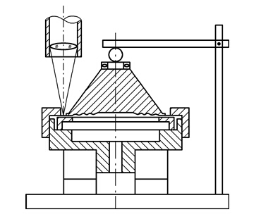 图所示为一种用机械方法固定膜片的夹具,这种夹具无需氮气室,而是用一个金字塔形的金属块压紧膜片内部,膜片外缘用一个压圈压平,只露出焊缝部份承受激光光束的照射,焊接效果很好。